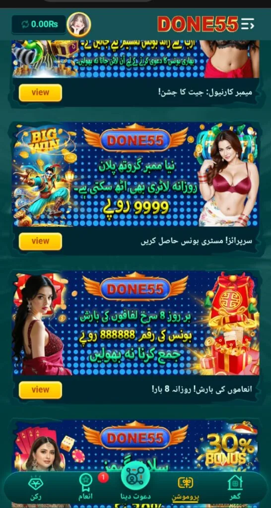 In summary, Done 55 Game offers a simple and entertaining gaming platform for players in Pakistan. The app provides many fun games such as slots, Teen Patti, Andar Bahar, fishing games, and sports games.
